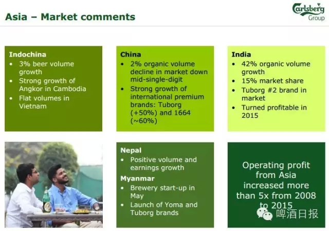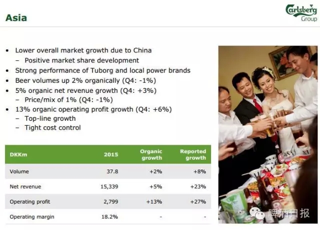 嘉士伯CEO说:“2015年,亚洲业务继续表现强劲,但是西欧和东欧市场比较困难。因此,增长的亚洲市场在嘉士伯集团的版图中占据越来越重要的位置了。”