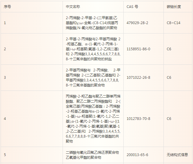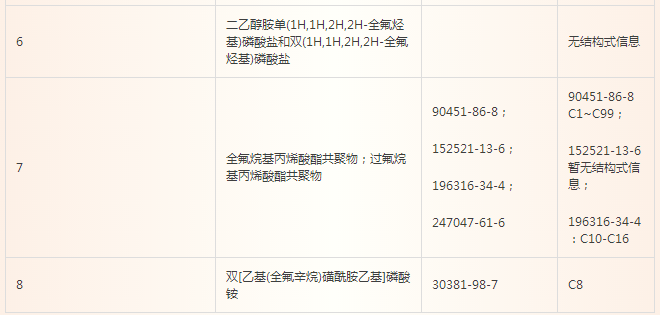 在食品接触材料监管较为完善的美国,其食品接触材料相关的法典—21 CFR 中关于纸和纸板的部分(176.170)中规定可以使用的含氟防油剂有6种,FDA于2016年1月发表声明表示即将禁止其中三种涉及到C8含氟物质,拟禁止的三种特定的含全氟烷基乙基的物质(FCSs)为: