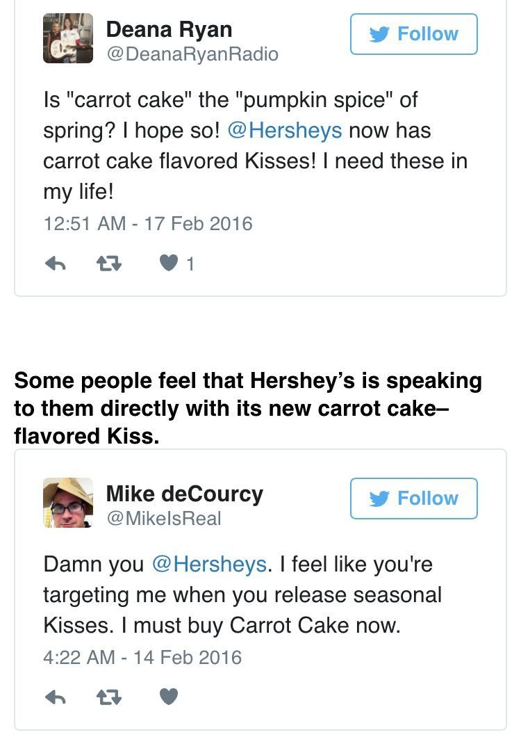 “你想到复活节的时候,一定会想到小兔子,那也一定会想到胡萝卜。”好时的新闻发言人 Lauren Aardewijn 解释说,“所以没有比胡萝卜蛋糕口味的巧克力更合适复活节的了。”小兔子是复活节的一个象征物,因为在基督徒眼中,复活节象征着重生与希望,而小兔子具有极强的繁殖能力,人们就把兔子视作新生命的创造者。复活节时美国人通常会购买许多糖果,去年复活节期间美国糖果的销售额超过了 20 亿美元。