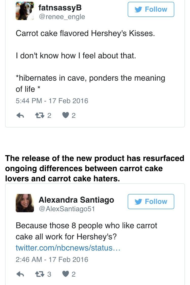 虽然复活节兔子是节日期间最抢手的商品,但对于巧克力来说,胡萝卜蛋糕口味还是太过猎奇了。于是在推特等社交平台上,有人吐槽大呼崩溃,说要重新思考一下人生;有人觉得好萌,迫不及待地要去尝鲜。