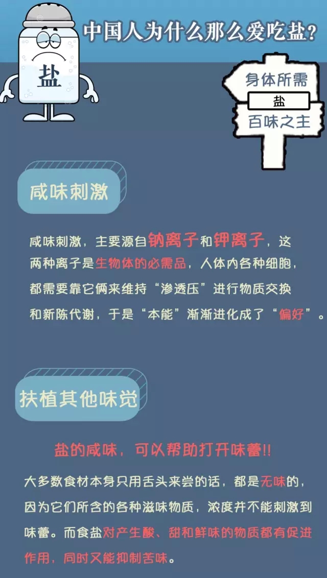 尽管“盐摄入超标”已成困扰现代人的一大健康威胁,很多人吃饭还是无盐不欢的重口味,就算嗜甜如命的人也没少吃盐。除了烹饪方式外,我们从生理需求分析下,为什么中国人那么爱吃盐?