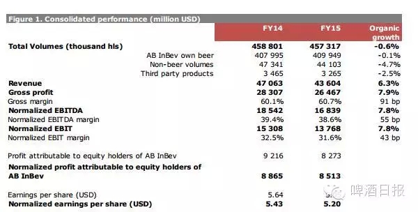 从全球来看,由于高端品牌销量的提升,2015年百威英博全年营收增长6.3%,总体销量较去年下降0.6%,净利润增长7.9%,税息折旧及摊销前利润(EBITDA)增长7.8%。三大全球品牌表现不俗,总营收增长12.6%,总销量增长7.3%。