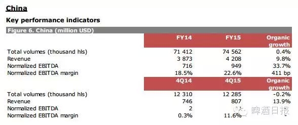 2015年,公司在中国市场的营收增长9.8%,每百升营收增长9.4%。得益于营收增长,运营效率提升和第四季度一次性获得,中国的税息折旧及摊销前利润(EBITDA)增长33.7%。