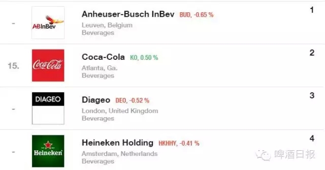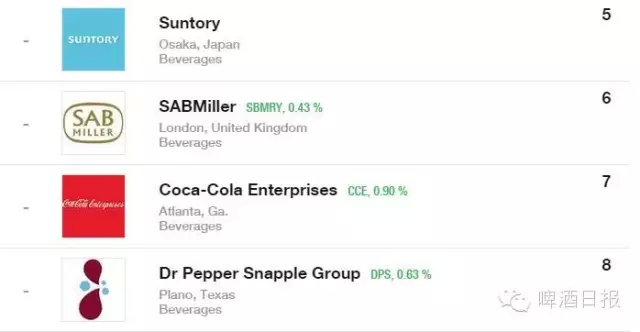 最后,再播报一条百威英博的好消息。最新出炉的《财富》杂志2016最受尊敬企业中,百威英博荣登了饮料行业的榜首,并且意外地超越了可口可乐。其他上榜的饮料公司包括喜力,SAB米勒,三得利等。