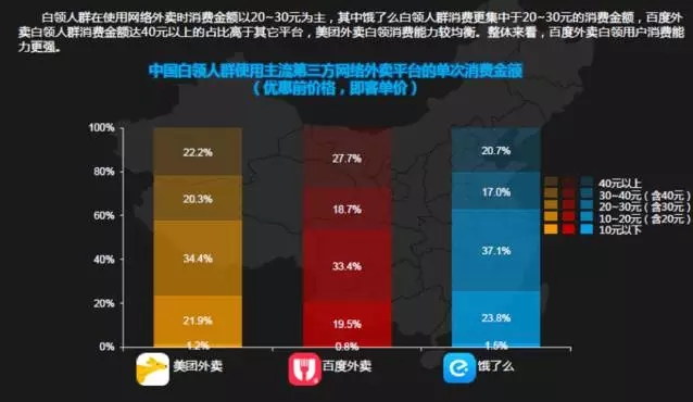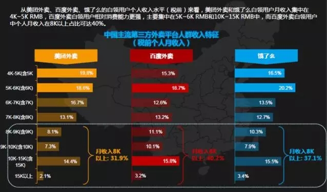 从白领用户个人收入水平开看,美团外卖和饿了么白领用户主要集中在4K-5K之间,百度外卖白领用户收入主要集中在5K-6K和10K到15K之间,在8K以上的用户占比可达40%,消费能力也更强。一顿20-30元左右价格的饭对于白领人群来说不会构成太大问题。