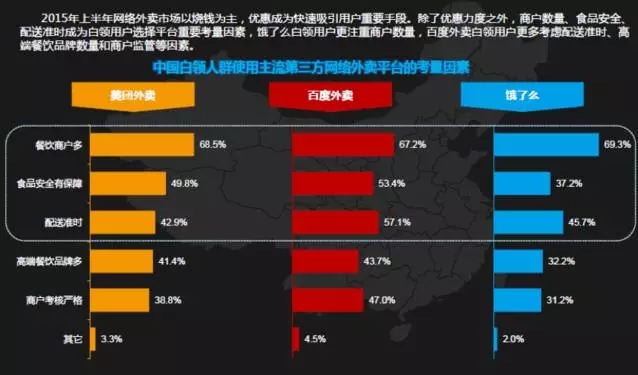 外卖O2O市场中,白领的人群画像为高频、高单价消费、高黏性、对价格不敏感,并且对物流准时配送,品质以及多元服务有着更大的诉求。当补贴大战消退之后,白领市场所受的影响会最小,而未来更大的增长点也将继续集中在白领市场,而目前在百度外卖、美团外卖、饿了么的三分天下格局中,百度外卖比同类竞品在各方面都更为领先一些,有着更大的市场潜力。