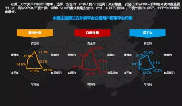 在调查中,白领用户最关心的六个维度分别是高端、品质、安全、时尚、实用、便捷,其中高达90.3%的百度外卖白领用户认为百度外卖是安全的,美团外卖次之,饿了么则相对分数较低。