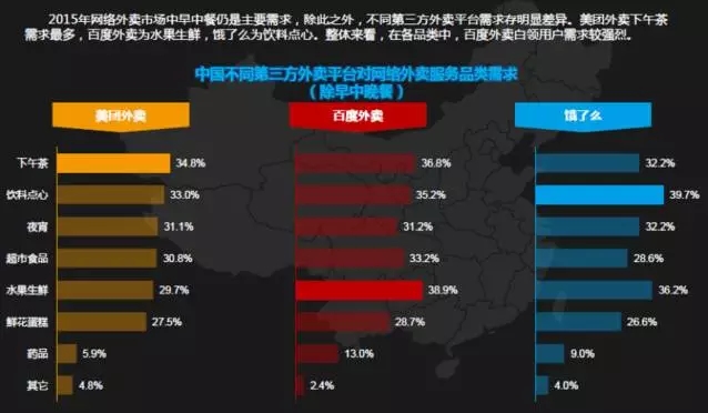 以上这张图是除了餐饮需求外的对比,在这张图中,美团外卖的用户对下午茶的需求较多,百度外卖的用户对水果生鲜要求多,饿了么的用户对饮料点心的需求较多,各有不同,百度外卖白领用户的整体性需求比较强。