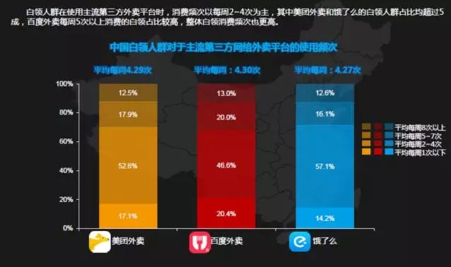 白领群体的消费次数每周以2-4次为主,从平均来看美团外卖为4.29次,百度外卖为4.30次,饿了么为4.27次,彼此不分伯仲,但是从整体上来看,百度外卖的白领人群整体频次更高。