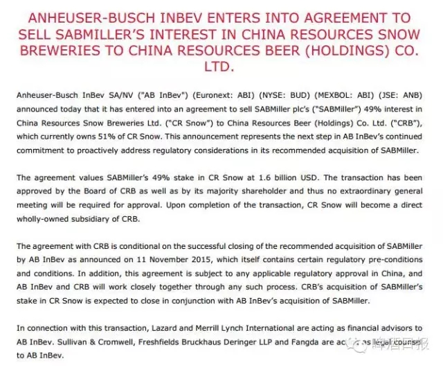 百威英博3月2日发布新闻稿宣布,他们将把SAB米勒所持有的华润雪花49%股权以16亿美金的价格卖给华润啤酒。这也就是说,华润啤酒将全资控股雪花啤酒。而对于百威英博而言,这是解决“世纪并购案”产生的监管问题的又一大重要进展。