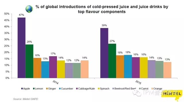 从Mintel统计的数据上来看,全球冷压蔬果汁TOP10的口味中,姜风味的使用在增加,蔬菜类比如黄瓜、菠菜、甜菜和胡萝卜风味也呈上升趋势。
