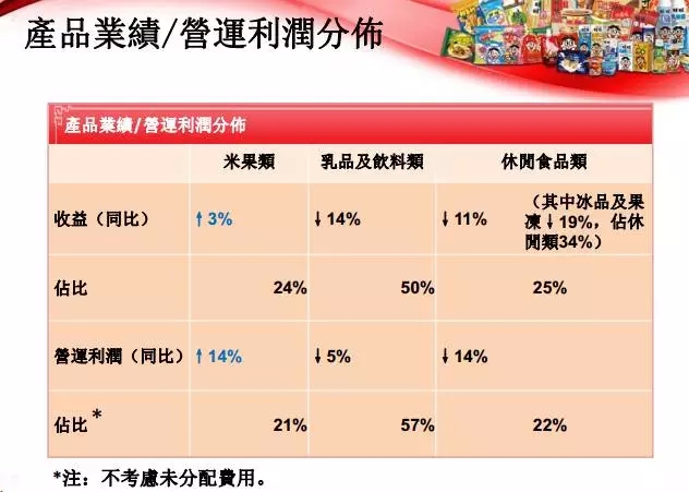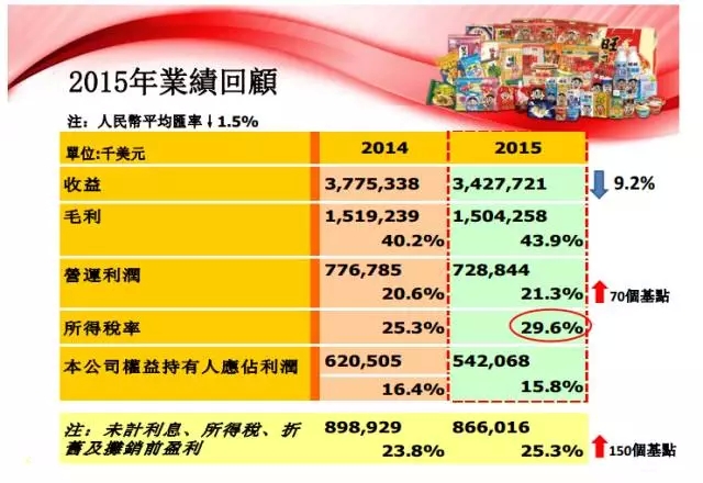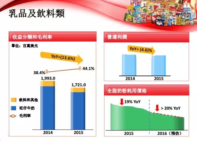 2015年乳品及饮料类收益17.210亿美元(约112亿人民币),较2014年衰退13.6%。其中占乳品及饮料类收益约90%的“旺仔牛奶”收益15.444亿美元(约100亿人民币),因受大环境疲弱及行业去库存削价促销影响下,较2014年衰退13.5%。