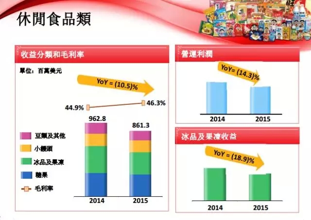 2015年休闲食品类收益衰退10.5%,从2014年的9.628亿美元下降至2015年的8.6亿美元(约56亿人民币)。主要因受2015年“凉夏”天气对冰品及果冻类产品需求产生不利影响,使该小类收益衰退近20%所致。