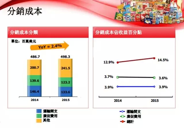 在企业运营成本方面,得益于大宗产品的价格大幅下降,旺旺的销货成本较2014年下降了14.7%,广告促销费用亦有所减少;此外,旺旺“分布式光伏”试点项目已于2015年正式启动,并将逐步推进。