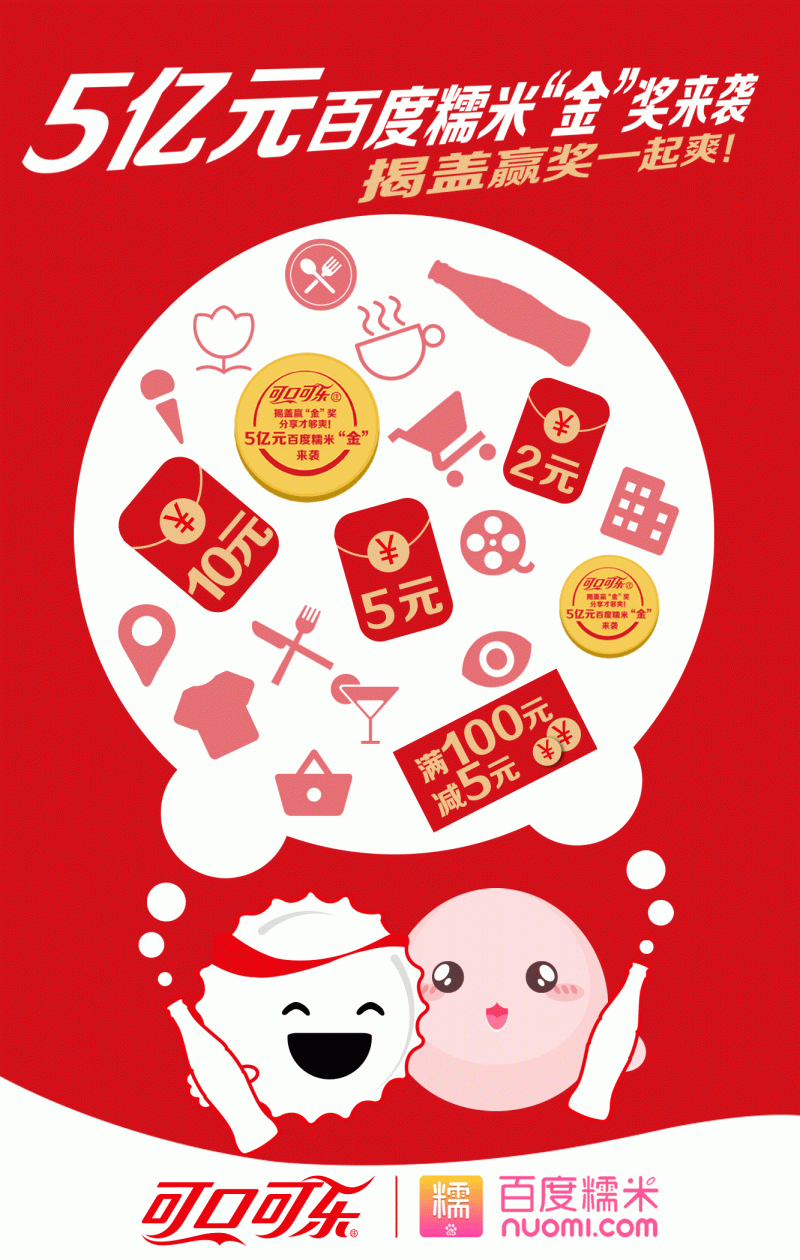 2016年,可口可乐和百度糯米合作,发出5亿元百度糯米“金”奖,“金”奖为百度糯米现金红包和满100元减5元百度糯米抵用券总称,奖品总价值5亿元。奖券可以在糯米平台任意使用,这样不仅可以提升客单价,还能提升用户整体感受。
