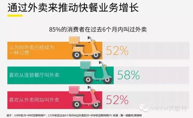 同时,对于就餐时间,英敏特数据表明,30%的快餐店顾客表示相比半年前,他们在早餐时吃快餐的次数增多,42%的快餐店顾客表示,他们在午餐时吃快餐的次数增多了,但有 26%则表示相比一年前,其在晚餐时吃快餐的次数变少了,该流失比例在所有的就餐场合中是最高的。