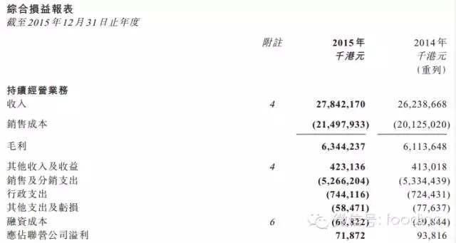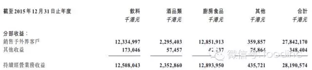 年报显示,其中持续经营业务收入增加6.1%,由2014年的262.39亿港元增加至2015年的278.42亿港元;持续经营业务的经营利润增加92%,由2014年的3.2424亿港元增加至2015年的6.2385亿港元(以上数据不包含按香港财务报告准则第5号分类为终止经营业务之休闲食品业务分部“终止经营业务分部”相关的业绩数据)。