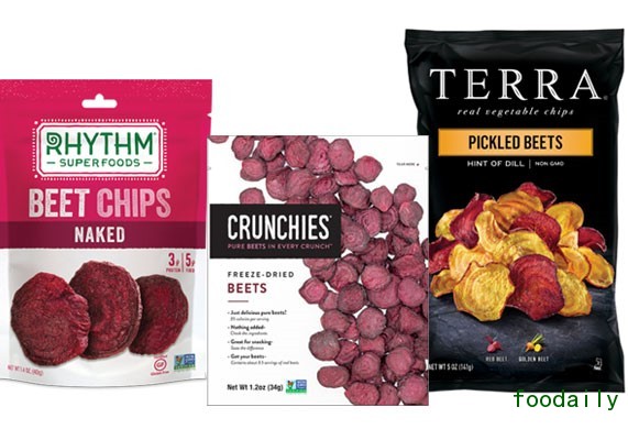 来自纽约成功湖旁的Hain Celestial Group’s Terra公司推出了芹菜根脆片和腌甜菜脆片,红色和金色的甜菜,加上一点点的莳萝。加利福尼亚Westlake的Crunchies Natural Food公司推出冷冻干燥甜菜零食,德克萨斯州Austin的Rhythm Superfoods推出了甜菜脆片零食。这款最新的产品的特点是薄脆,脱水甜菜,包括三种口味:原味、海盐口味,以及肉桂配上椰子糖口味。