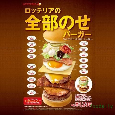 从 4 月 28 日起到 5 月 31 日,快餐连锁店 LOTTERIA 在日本市场推出一款期间限定的 ALL IN 汉堡,简单讲就是“啥都有汉堡”。