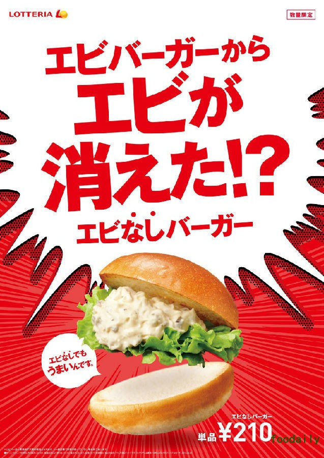 比如去年 4 月,LOTTERIA 就把旗下招牌炸虾汉堡的炸虾拿掉,推出了一款“没有虾仁的汉堡”,只有面包、生菜和酱料,比一般的炸虾汉堡便宜 130 日元,引起热议。然后到了 4 月 28 日,它们就推出了“新炸虾汉堡”,声称虾仁增量 1.5 倍,所谓的“没有虾仁的汉堡”就是一次话题/饥饿营销。