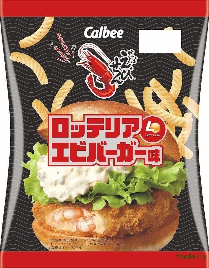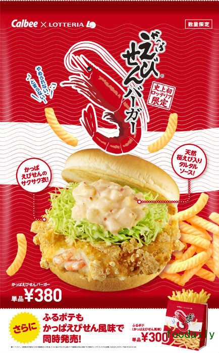 日本公司 Calbee 出品的著名膨化零食河童虾条在当时和 LOTTERIA 合作,两家同时推新品——LOTTERIA 卖的是一款用虾条碎当汉堡肉面衣、虾条粉当薯条蘸酱的套餐;Calbee 则开卖一款“LOTTERIA 炸虾汉堡味虾条”,嗯,其实就是色拉酱风味的虾条。你中有我我中有你。