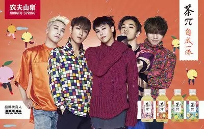 而在近日,BIGBANG又被曝出牵手新锐国产饮料,为农夫山泉今年新推出的一款果味茶饮料新品--“茶π”代言。这是BIGBANG首次代言中国品牌。