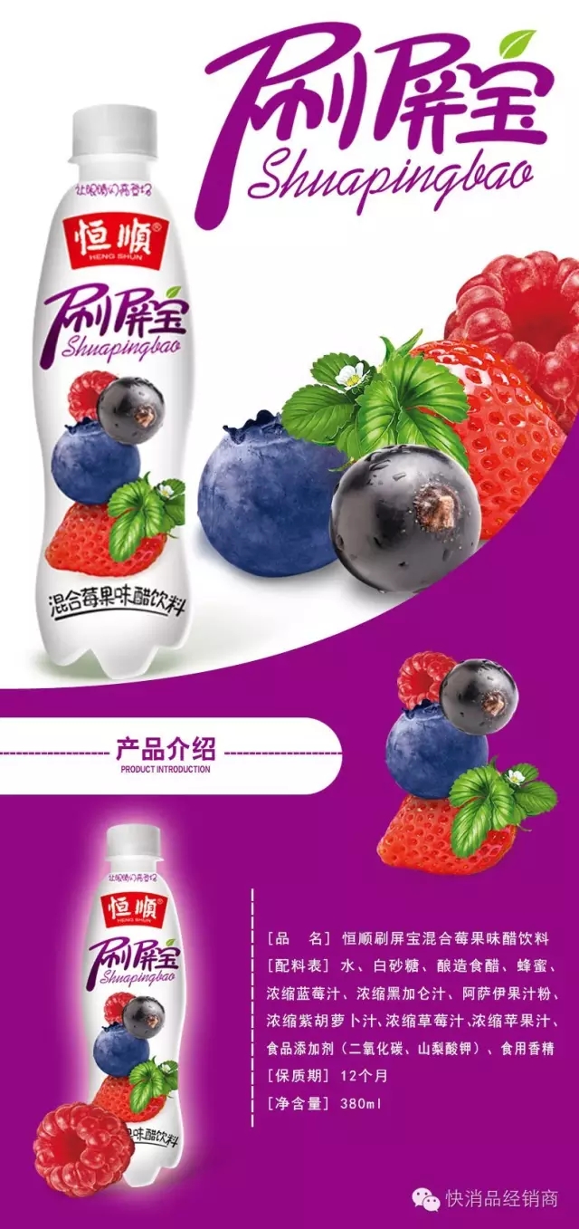 在信息大爆炸的时代,每天看书,上网刷屏等刺激着我们的眼睛。尤其是白领一族,每天有大半的时间在电脑前度过,白领一族、刷屏一族急需要一款能够呵护眼睛的饮品。那么恒顺刷屏宝应运而生,采用高品质蓝莓汁,富含花青素,护眼抗氧化,上网刷屏时来一罐养眼又健康。同时添加纯粮酿造的恒顺食醋,含有黑加仑汁、阿萨伊果汁粉等多种浓缩果汁,加入优质蜂蜜,日常饮用和佐餐两相宜。