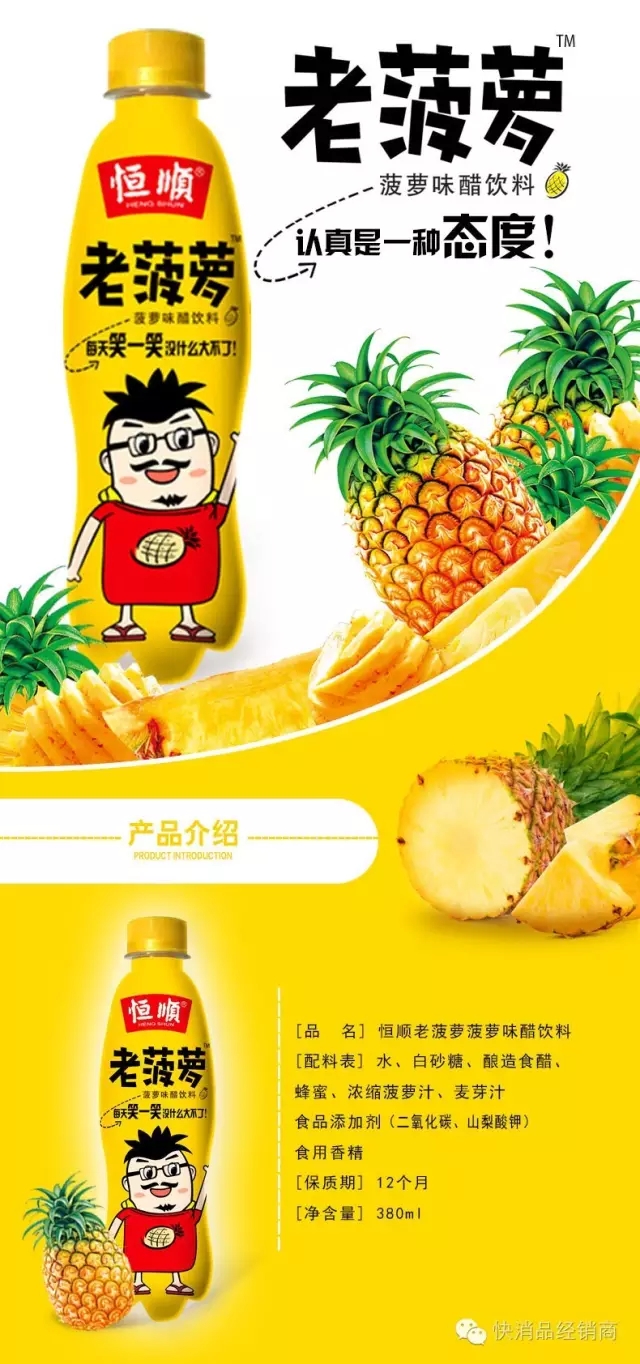 恒顺老菠萝,好原料成就好饮料。就像大叔的帅不光帅在表面一样,恒顺老菠萝不光有Q萌的歪脖造型,好原料也是它成功的秘笈。恒顺老菠萝采用高品质菠萝汁,添加纯粮酿造的恒顺食醋,加入优质蜂蜜,果香柔和,清爽酸甜,让无数萌妹子欲罢不能。值得一提的是,恒顺老菠萝、恒顺小苹果系列产品主打“大叔配萌妹”的情侣牌,也使得它成为了时下年轻人表达爱意的最In神器。