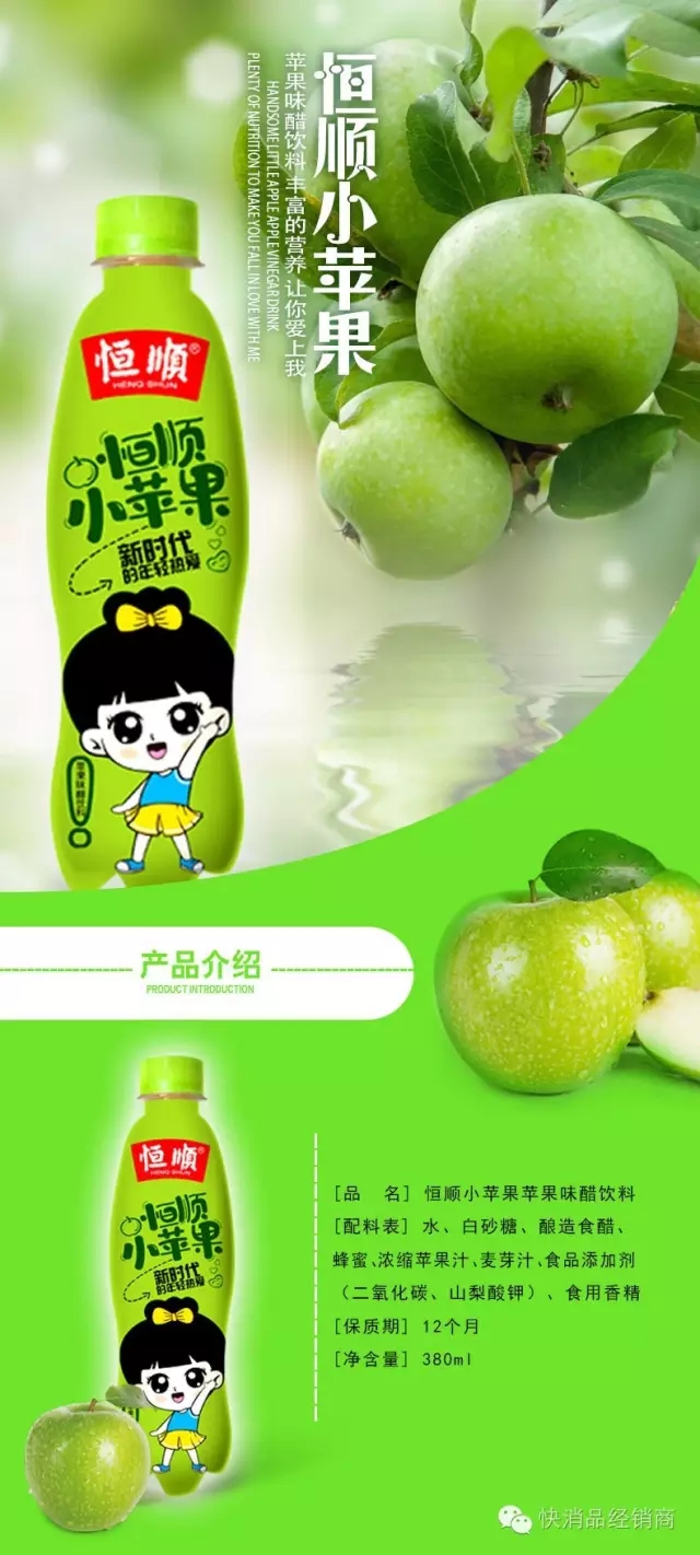 自2014年10月上市以来,恒顺小苹果凭借其清爽酸甜的口感和清新Q萌的外形,受到越来越多年轻人群尤其是90后00后的喜爱,恒顺小苹果采用高品质苹果汁,添加了纯粮酿造的恒顺食醋,加入优质蜂蜜,在保留纯正柔和的苹果香气之外,口感更清爽。