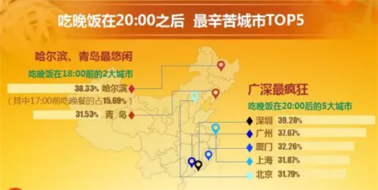 广深最疯狂:39.28%的深圳消费者晚饭时间在20:00之后,37.67%的广州消费者晚饭时间在20:00之后。