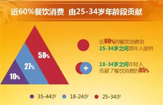 58%的餐饮消费由25-34岁的青年消费者贡献,85%的餐饮消费由18-34岁的年轻消费者贡献。