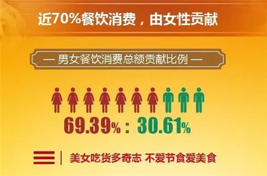 数据显示,男女餐饮消费比例为69.39%:30.61%,近70%的餐饮消费由女性贡献。