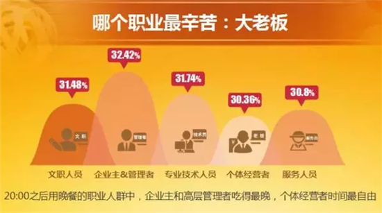 20:00之后用晚餐的职业人群中,企业主和高层管理者吃得最晚,个体经营者时间最自由。