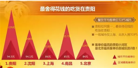 餐饮平均客单价TOP5城市中,贵阳位列第一,一线城市仅上海、北京入围TOP5。