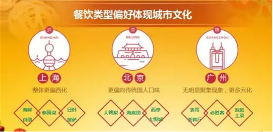 上海整体更偏西化;北京则是更加倾向于传统国人口味;广州没有明显的倾向,更加多元化。