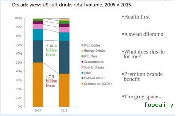 上图来自于欧睿国际公司的数据,高度关注了在过去10年内,碳酸软饮料品类所丢失的市场份额,虽然果汁类产品品类的市场份额也在下降。消费者到底在喝什么呢?答案是瓶装水(当然是最大的赢家)、能量饮品、即饮咖啡和茶、运动饮料,首席饮料分析师Howard Telford在2016年2月份的饮料创新峰会上这样谈到。本文来源为FOODAILY,如转载请注明出处,违者必究。