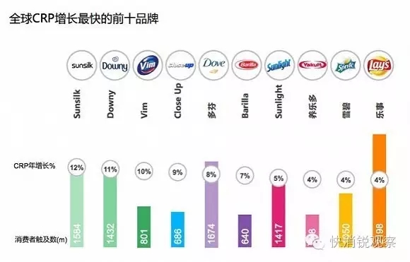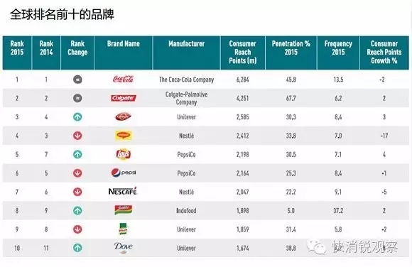 可口可乐依然是全球消费者选择最多的品牌。国际品牌的增长并未终结, 排名表现突出的品牌包括高露洁(净增消费者数量最多)、卫宝、乐事,和多芬。高露洁是全球唯一渗透率超过50%的品牌。Sunsilk继续表现强劲,特别是在新兴市场。