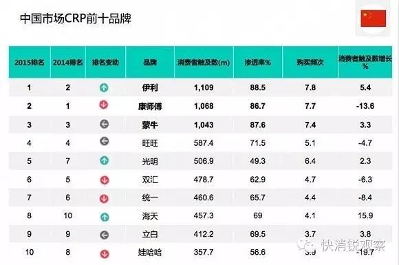 过去一年,88.5%的城市家庭购买伊利品牌7.8次,也就是消费者购买该品牌超过11亿人次。 通过高端常温酸奶等品类拓展,以及在下线城市的迅速扩张,伊利明显提升其消费者规模和购买次数,跃居中国快速消费品榜首。此外,康师傅和蒙牛的购买次数也超过10亿次,分列第二和第三位。在排名前十的品牌中,海天、光明、立白通过地域扩张和营销创新逐步扩大购买人群。