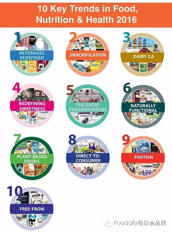 英国New Nutrition Business给出了2016全球食品营养健康十大趋势,包括饮料工业大洗牌,零食化,乳品新升级,甜味新定义,市场多样化,天然健康,纯植物食品,消费者直达,蛋白以及不含XX等,涉及品类变化、营养、配料和消费习惯等不同角度。其中,饮料行业的变革、天然与功能化、纯植物性食品和追求蛋白质成为推动含蛋白饮料发展的4个原动力。