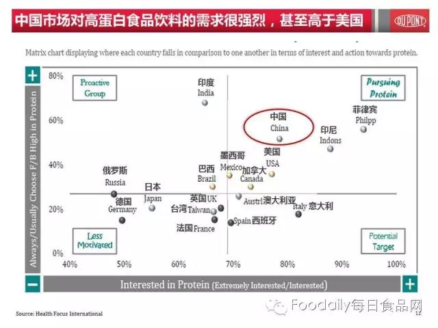 Health Focus International公司所做的一项调查结果显示,以“对高蛋白食品感兴趣的程度”和“日常购买高蛋白食品的频次”作为2个维度考察主要的经济体国家,中国在2个维度上均有较高的分值,表明中国市场对高蛋白食品饮料的需求非常强烈,甚至超过了蛋白类食品堪称最为丰富的美国。