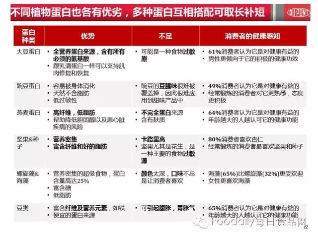 根据杜邦研究数据显示,消费者更爱喝原味的多种植物蛋白饮料,并且适用于不同饮用场合的产品是市场拓展的机会点。2016年全球上市了各种不同蛋白组合的饮料产品,如大豆+杏仁、杏仁+椰子、杏仁+燕麦等等。植物蛋白饮料中添加藜麦、火麻仁、玄米等远古概念谷物也是很好的差异化创新。不同的植物蛋白各有优缺点,消费者对其健康感知也大不相同,准确把握这些信息有助于设计出更完美的植物蛋白饮品。