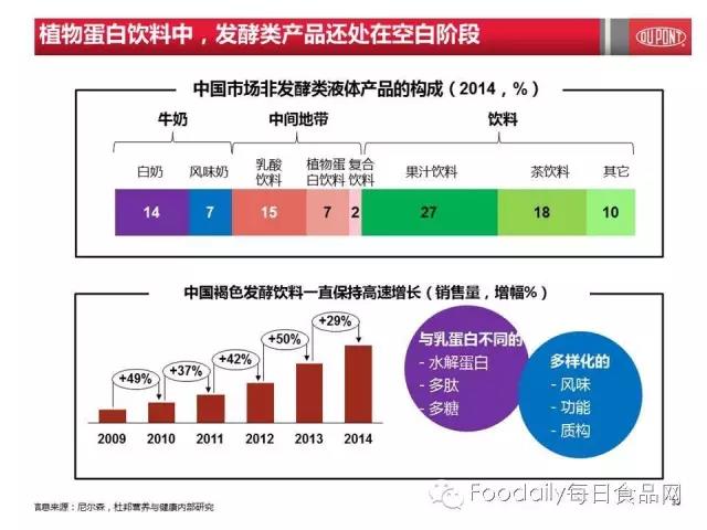 杜邦认为,目前在植物蛋白饮料中,发酵类产品还处在空白阶段。根据尼尔森2014年的一项统计数据,中国市场上非发酵类饮品中,牛奶制品(白奶、调味乳饮料)约占21%,饮料(碳酸饮料、果汁、茶与咖啡、水等)约占55%,而剩余24%的所谓“中间地带”则代表了发酵类植物蛋白饮料的未来市场空间。另一项调查研究结果则显示,中国褐色发酵饮料一直保持高速增长。
