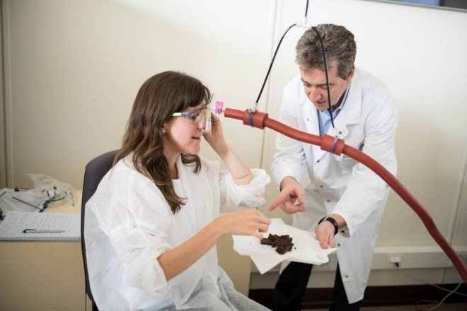 接下来参观的是一个有关味道的实验室,研究口感和香气的科学家Heiko认为自己是这个大楼里最幸福的科学家。他用一个实验室告诉了我们一个有意思的事实,吃巧克力把鼻子捏住,就像是一种惩罚,味同嚼蜡,因为嗅觉和味觉共同构成了味道这件玄妙的事。他还告诉了我们一件事,为什么巧克力有不同的形状,难道只是为了美观?不是,不同形状的巧克力融化速度不同,带来的口感也会不一样。