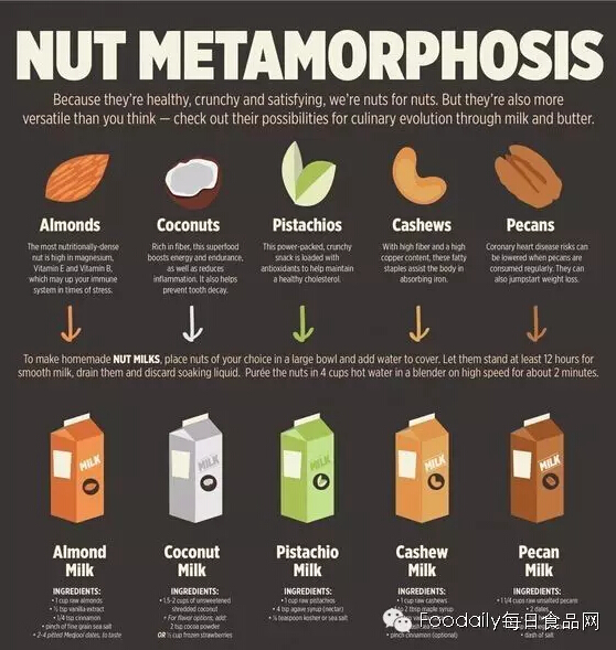 “人们对于乳糖和无牛乳产品的关注,促使近年来无牛乳饮品市场不断增长。”Innova市场分析公司的创新部主管Lu Ann Williams说,“这类产品以健康食品的形式,首先从亚洲传统市场开始扩张,逐步蔓延到西方市场。但是近年来,该品类产品逐渐进入了乳制品的主流领域,生产商们开始选择除了大豆以外开始选择其他更多的植物基食物作为乳制品的原料,首先就是坚果和谷物。”
