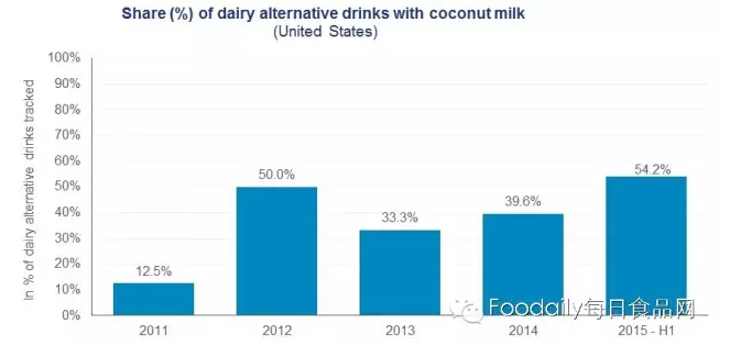 椰子乳已成为豆乳的首要选择替代品。根据Innova市场调查显示,在2015年的上半年,椰子乳占据了大部分的牛乳替代品新产品。