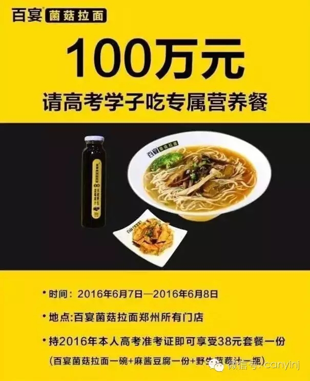 正如今年“高考”期间,郑州的百宴菌菇拉面为了助力高考学子能在考试期间获得足够的营养,特别制定和搭配了高考学子专属的营养套餐。据说这种营养的王牌搭配,能够充分满足考生的营养需求,还能长时间保持充沛体力,为此能让考生以最佳身体状态参与重要“战役”。
