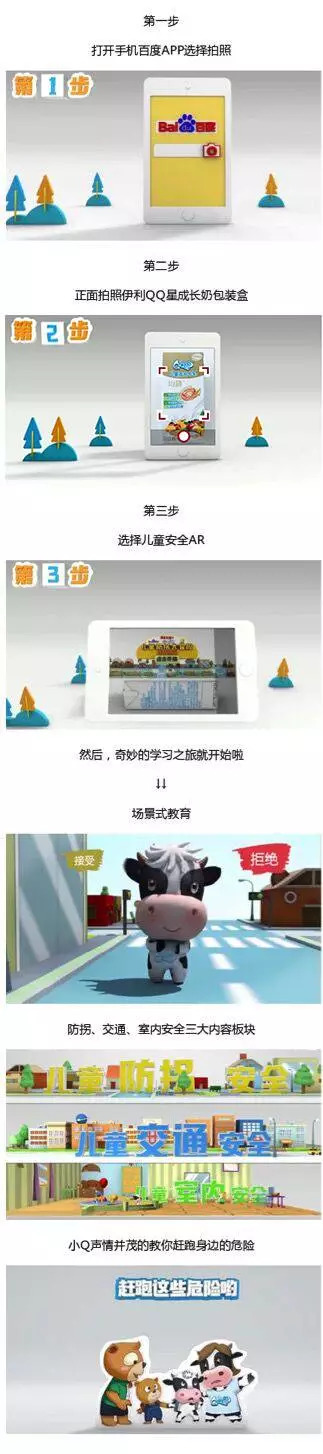 在此次合作中伊利和百度都分别发挥了自身的优势,将最新的AR技术应用到了安全教育之中。而要体验这种充满科技感的安全教育也非常简单,一部手机、一盒QQ星儿童成长牛奶,就能轻松开启体验。