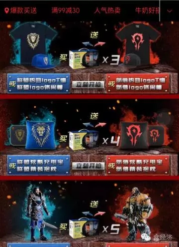 这次蒙牛除了特别定制的魔兽款牛奶盒,在配套周边上也是打起了情怀牌,推出了一系列周边促销活动。不仅每箱都附赠魔兽电影票,购买3箱以上,还会分别获赠T恤、充电宝、手办等纪念周边,价值和意义上都远超之前的小鸟定制周边。联盟和部落红蓝两色的PK感也能激起魔兽迷们心中的情怀感,大有鼓励游戏迷们为了支持自己的阵营去买买买的感觉。
