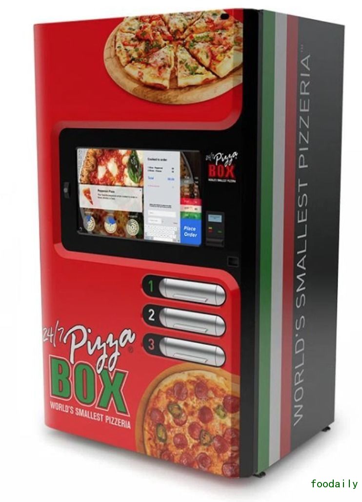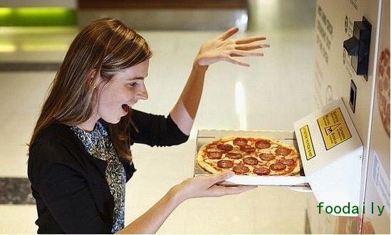 我们已经对自动贩卖机见怪不怪,可是提供现煮熟食的贩卖机还不算多。最近,披萨自动贩卖机有点儿火——食客将 5 美元左右的现金塞进那些红色的机器里,它们就开始工作了,机器先是自动混和面粉和水,将面团放到烤炉上压成饼底,再撒上客人挑选的肉类、蔬菜和调料。此时内置烤炉便开始以 380 度的高温快速烤制披萨。