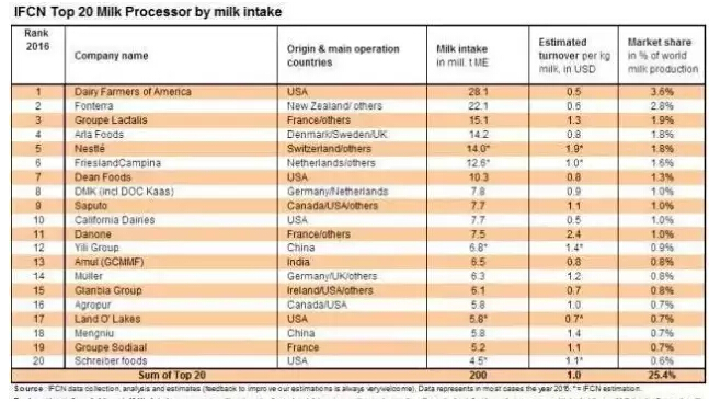 国际奶农联盟(IFCN)日前发布了全球乳品加工企业收奶20强榜单,2015年,20强企业收购了2亿吨原奶(标准乳),占全球原奶产量的25.4%。根据《消费日曝》的报道,2015年全球乳业第十的伊利在中国收购了680万吨原料奶,占全球奶产量的0.9%,位列第12位,2014年的名次是第16位(450-500万吨)。